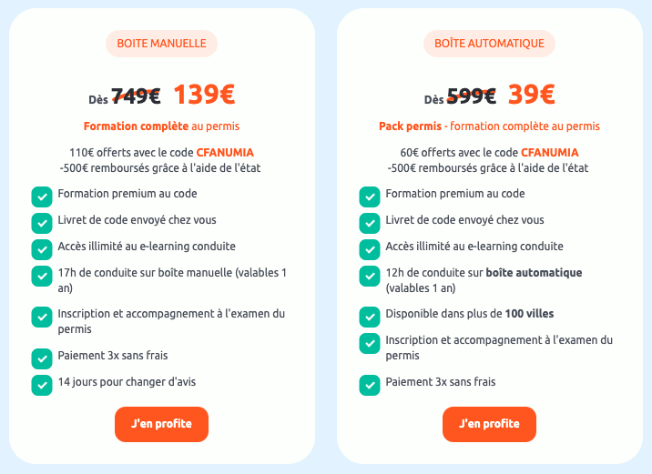 – 110€ sur le pack permis avec le code CFANUMIA = Un permis à 139€
